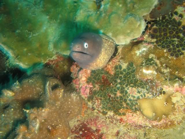 this dive site MACHA showed us the whip coral shrimp.. i didn't bring my camera down as i didn't wanna bother with cameras and stuff here. i also spotted a moral eel having its teeth cleaned by this tiny fish. hehe.. dunno what's the name of the fish laa..