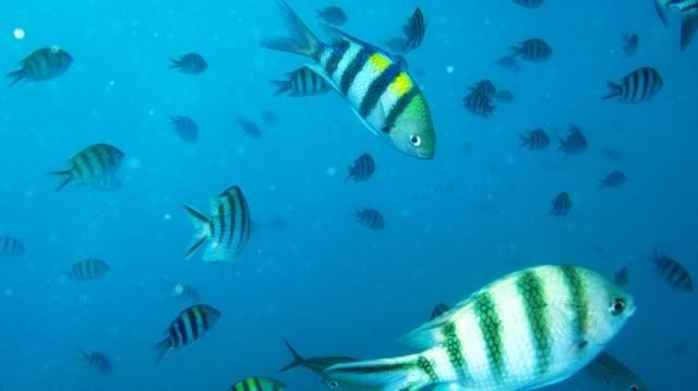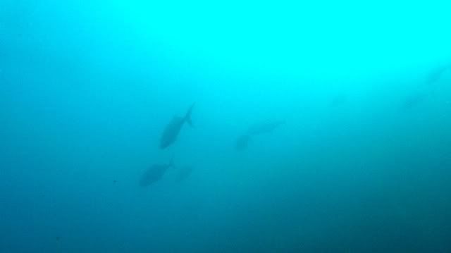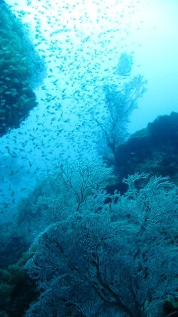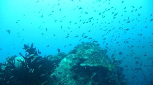 the vis was great. despite the rain. it was raining when we jumped off the boat. they said there are swim throughs.. i was afraid of that. i hate confined, dark spaces. but it was nice. only at the end of the swim thru, there was surge that pushed me and AJ to the rocks. otherwise a good dive.