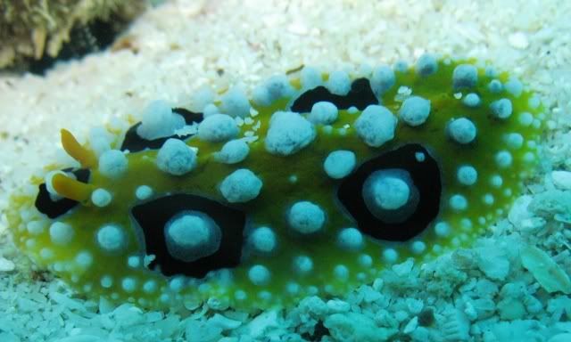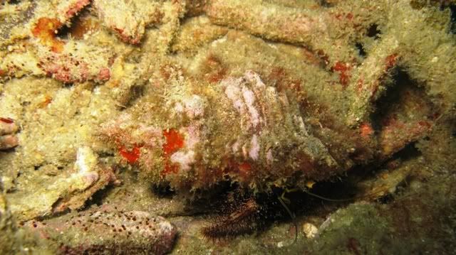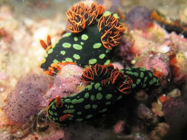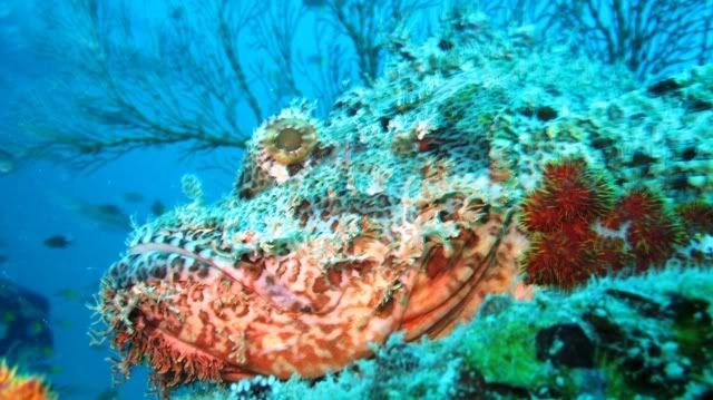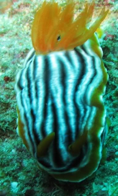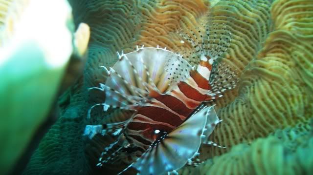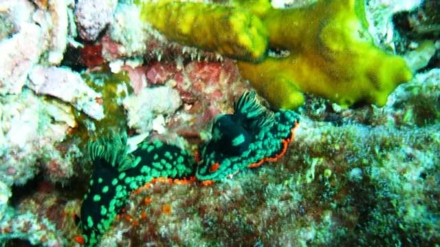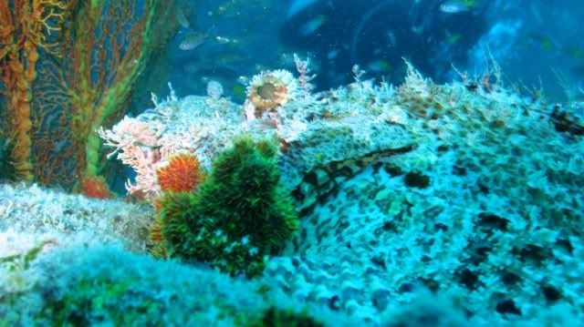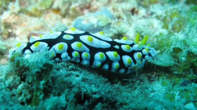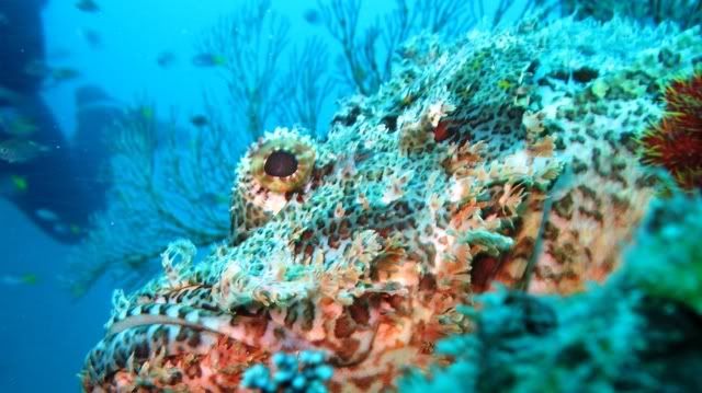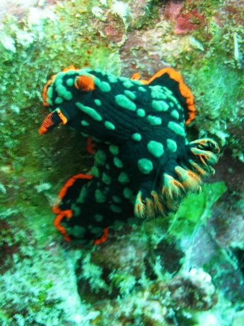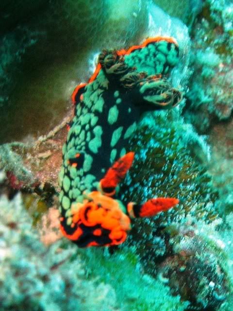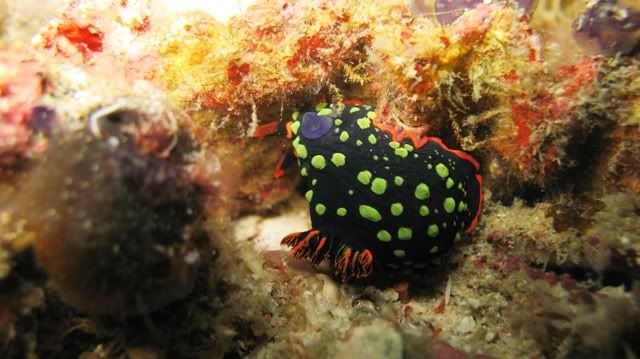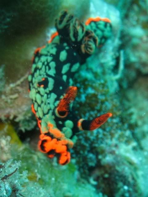 and the surge was quite strong.. i've been telling ikan that i wanted to see kurbayana. never had the chance to see one before..i didn't have problems equalizing.. unlike the first two dives. saw lots of nudis but i was having problems staying still. hehee.. so none of the pics were ermm... worthy to be shown here. saw a huge scorpionfish resting on the rocks. it was damn big lah. and then i saw another nudi. tried so hard to take a decent picture. *sigh* ... luckily aquaholic waited for me. i lost the group again. and a few minutes of circling around, i ran out of air. and we ascended.