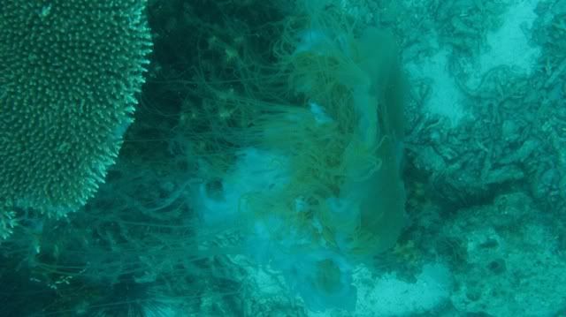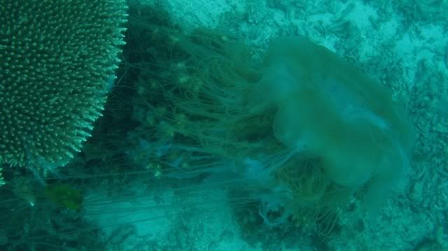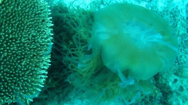 the jelly fish was stuck to the corals..